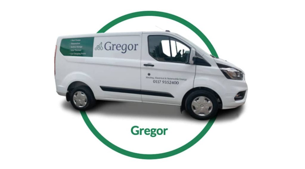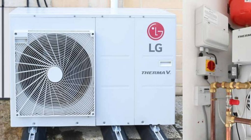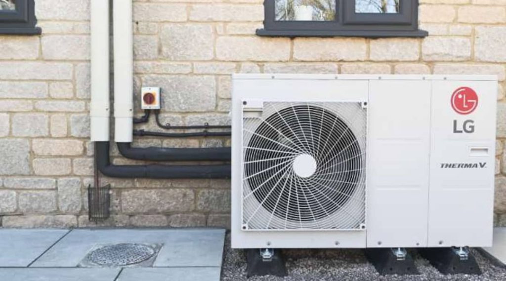 Air-source heat pump installation replacing oil heating, and solar photovoltaic panels installed.